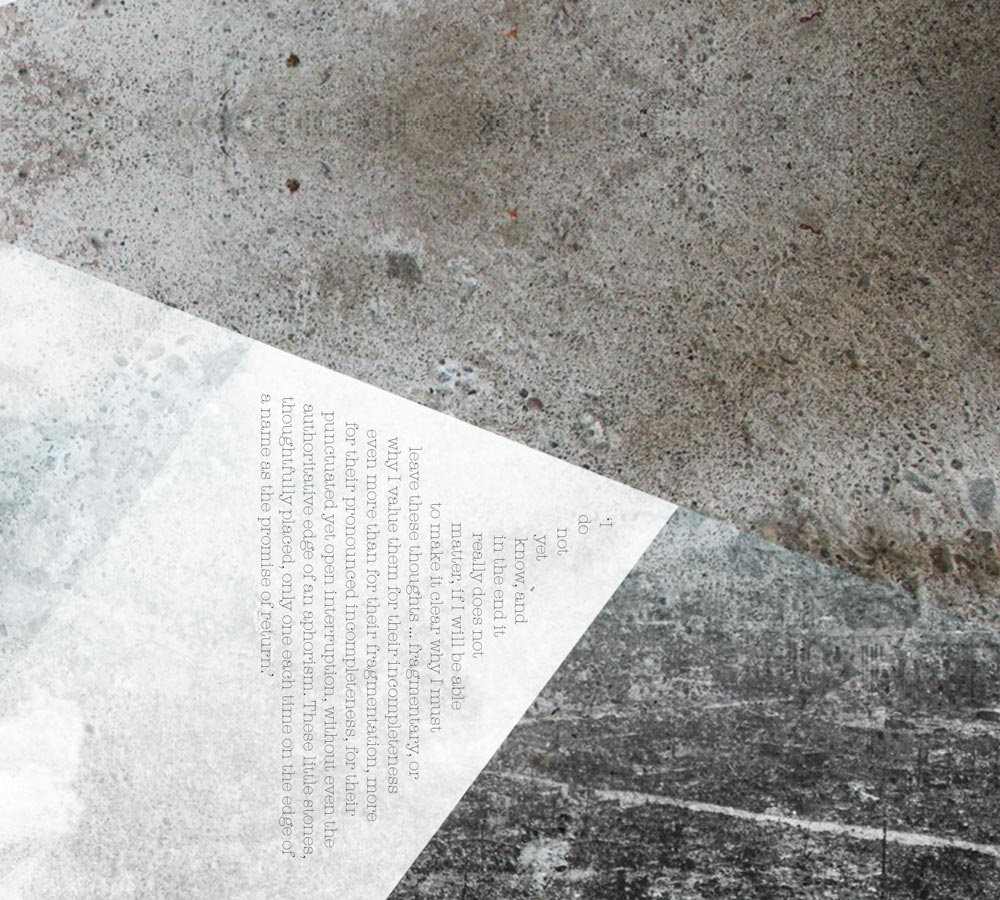 ‘I do not yet know, and in the end it really does not matter, if I will be able to make it clear why I must leave these thoughts … fragmentary, or why I value them for their incompleteness even more than for their fragmentation, more for their pronounced incompleteness, for their punctuated yet open interruption, without even the authoritative edge of an aphorism. These little stones, thoughtfully placed, only one each time on the edge of a name as the promise of return.’